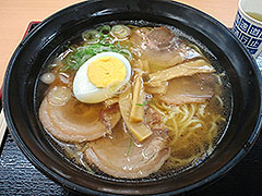 炙りチャーシュー、味付け卵、メンマに海苔の入った醤油ラーメン。